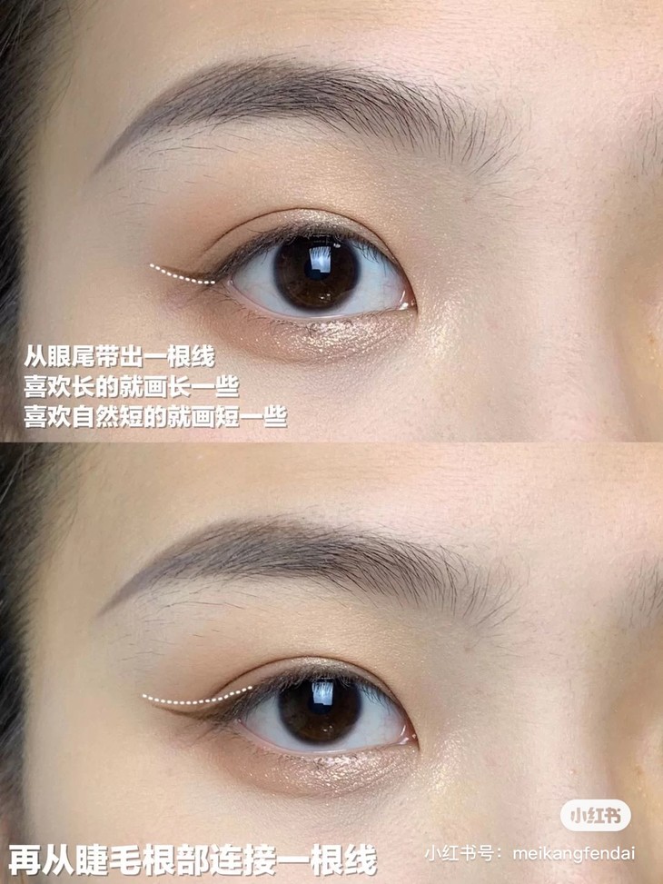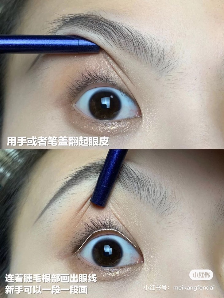 STRP 1:用手或者笔盖提起眼皮,连着睫毛根部慢慢画出眼线,新手可以分段画
