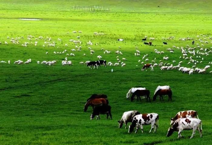 内蒙古的呼伦贝尔草原,水草丰美,有碱草、针茅、苜蓿、冰草等120多种营养丰富的牧草,有牧草王国之称,是一片绿色净土。
