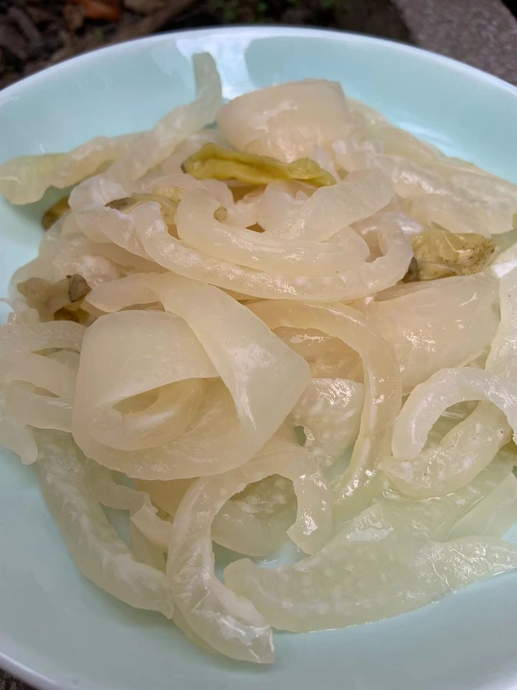 没有胃口的时候来上一盘,妥妥的下饭神器 泡椒的酸辣加上猪皮的嚼劲,让人欲罢不能 口感QQ弹弹的很有嚼劲