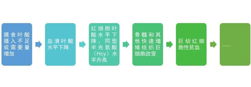 人体自身无法合成叶酸,因此需要从饮食或通过补充摄入。叶酸不足、缺乏一般要历经几个阶段(见下图)[1]。因此一般可通过检测血清、红细胞和尿液中的叶酸水平来评价机体叶酸状况。