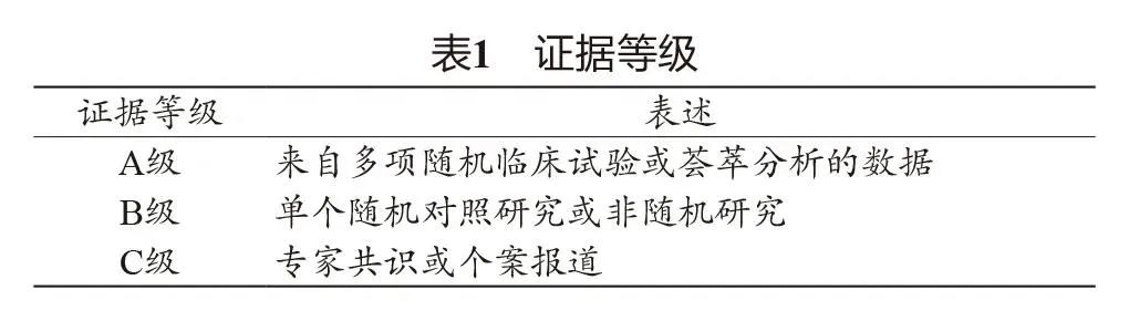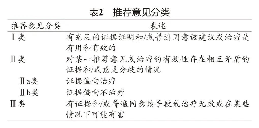1.2 形成推荐意见 对所有的检索文献进行分析和质量评价,形成推荐意见。本共识采用美国心脏协会的证据等级和推荐意见分类,具体见表1和表2。