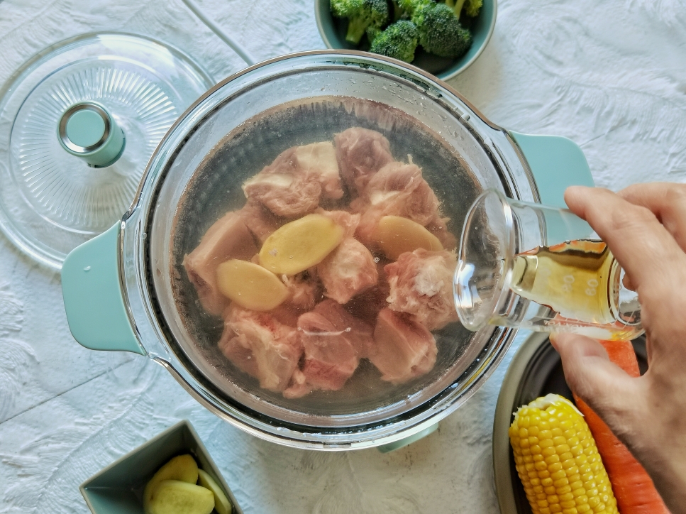 6. 洗干净的排骨放入东菱养生锅中,加入热水至快煮最高水位线处,放入3片生姜和葱结。