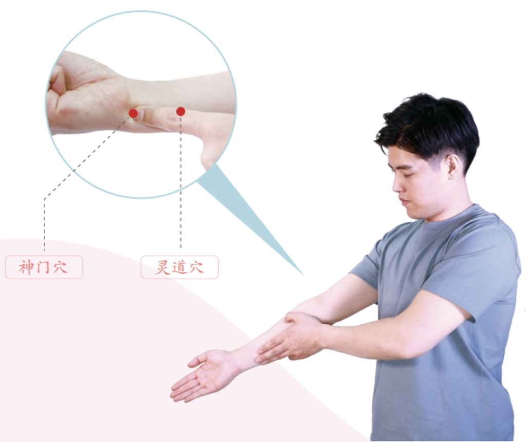 食指、中指、无名指并拢,中指略高,与其他二指呈凹槽型,把中指放在神门穴上,其余两指紧贴两侧皮肤,缓慢地向灵道穴方向逆推推完一侧手臂再推另一侧,每侧操作大约 30 秒钟。