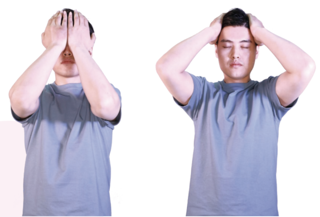将双手掌心搓热后,轻轻放在眼睛上大约 10 秒钟,反复熨目5遍,然后双手轻轻抚摩头发 10 ~ 15 遍。