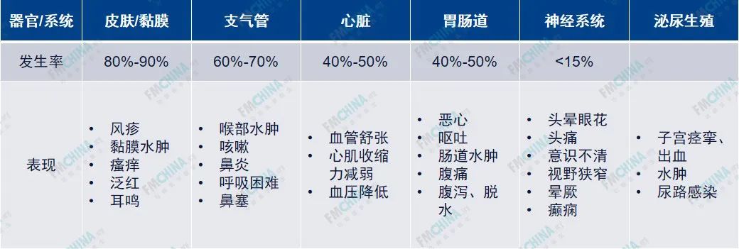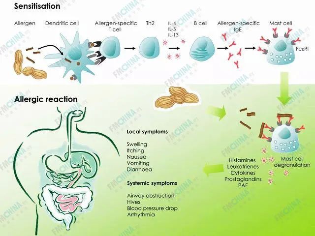 日常接触到的过敏源,可能会导致由IgE介导或IgG介导的一些反应。过敏源包含某些食物过敏原、药物,比如阿司匹林、消炎药或静脉注射用免疫复合物,都可能会引发过敏的反应。过敏反应会触发嗜碱性细胞/肥大细胞反应,然后释放出包含细胞因子、脂质介质、肥大细胞介质等,进一步可能引发了过敏症状,包含红肿热痛等。