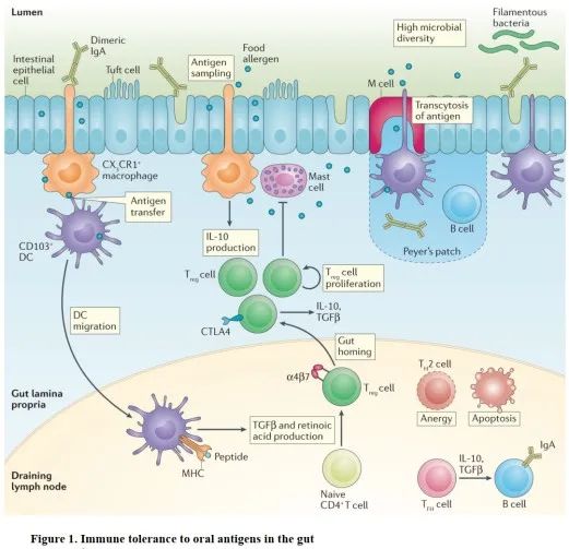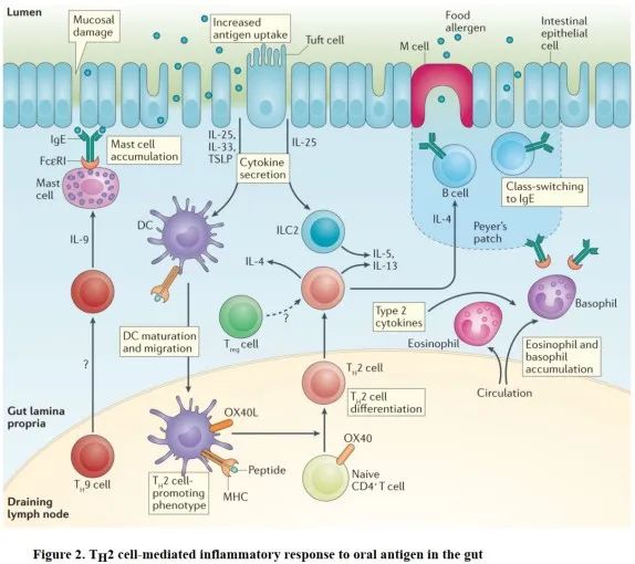 上述的这些情况,在图3中也可以看到。左边是食物不耐受性的一个反应,右边是属于过敏性反应,它们最大区别是在右边食物过敏反应中,有DC细胞呈递给T细胞的过敏原,Th2释放出细胞因子,进一步诱发的B细胞释放出免疫球蛋白IgE。因此,食物过敏是属于有明显的反应的类型。反观左边的食物不耐受反应,实际上是不产生免疫复合物的。