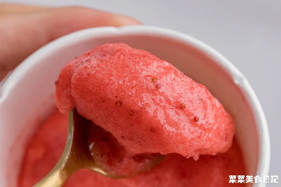 吃进嘴里雪葩滑溜溜地化开,最后嘴里还有草莓的感觉,妙啊~