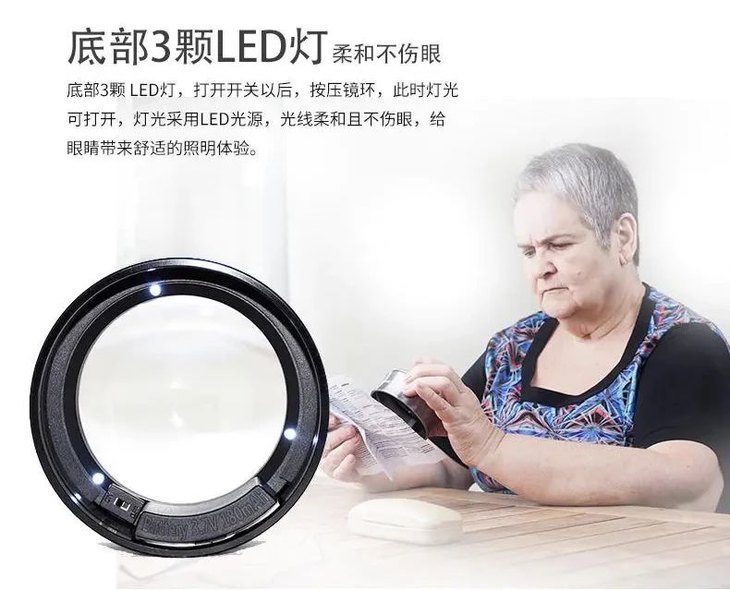 这是一款便携式的LED放大镜,放大约5倍,拥有74mm超大直径,视野更加开阔。