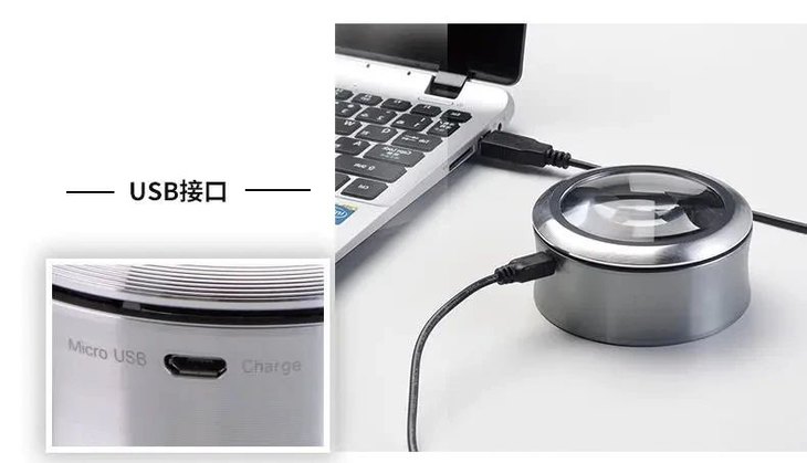 这款放大镜是手持桌面两用式的,自带LED调光功能。