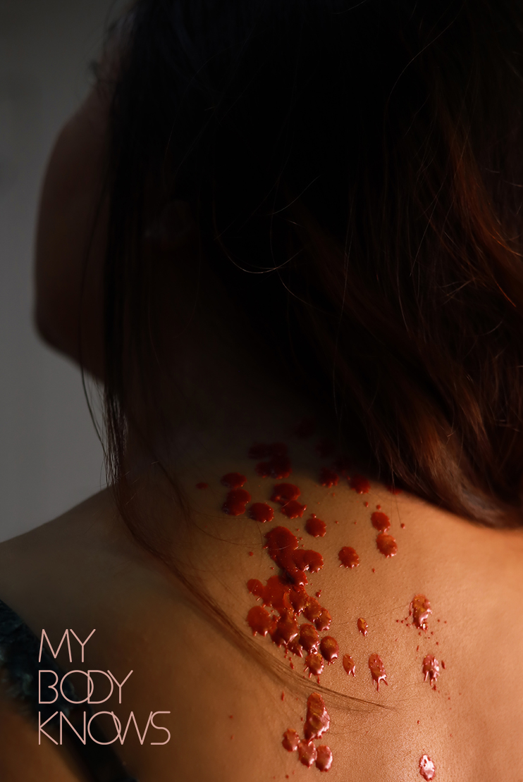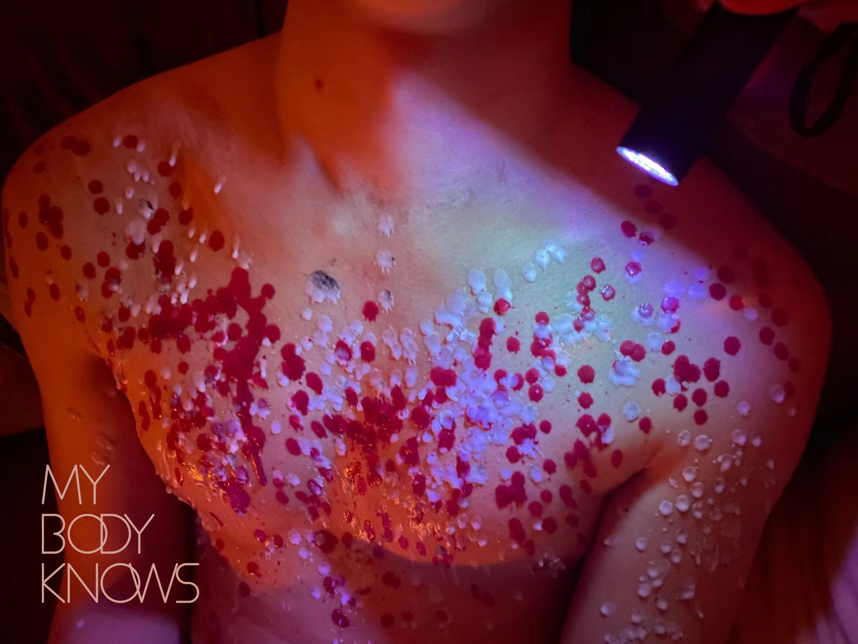 最后选择了血红色+可食用金粉(懂得都懂),是因为滴在皮肤上效果太美!满满的望眼欲穿,就好像在暗示我们等会要轰轰烈烈大干一场一样!!而且无论是肉眼还是想要拍照留念,效果都一绝。