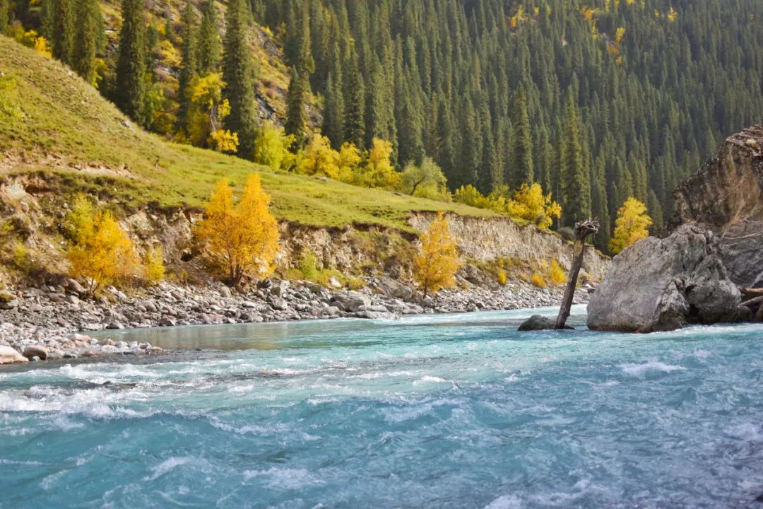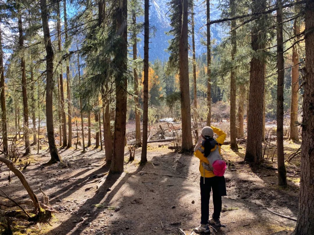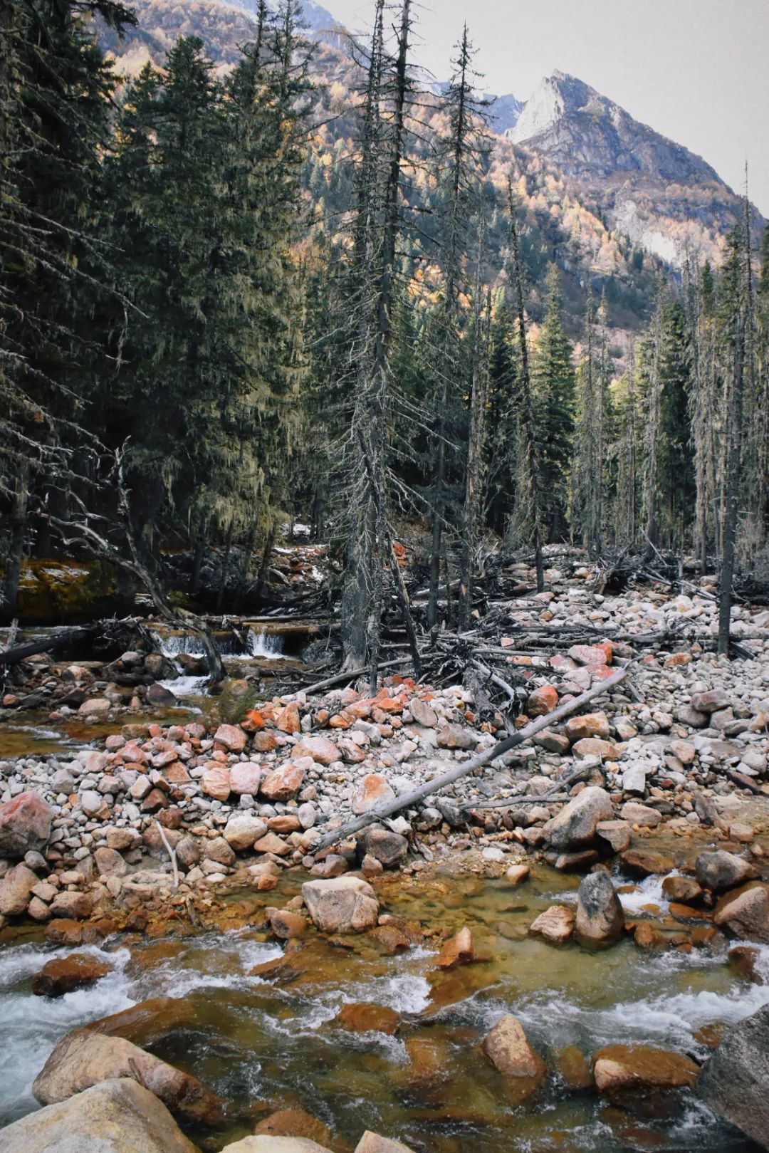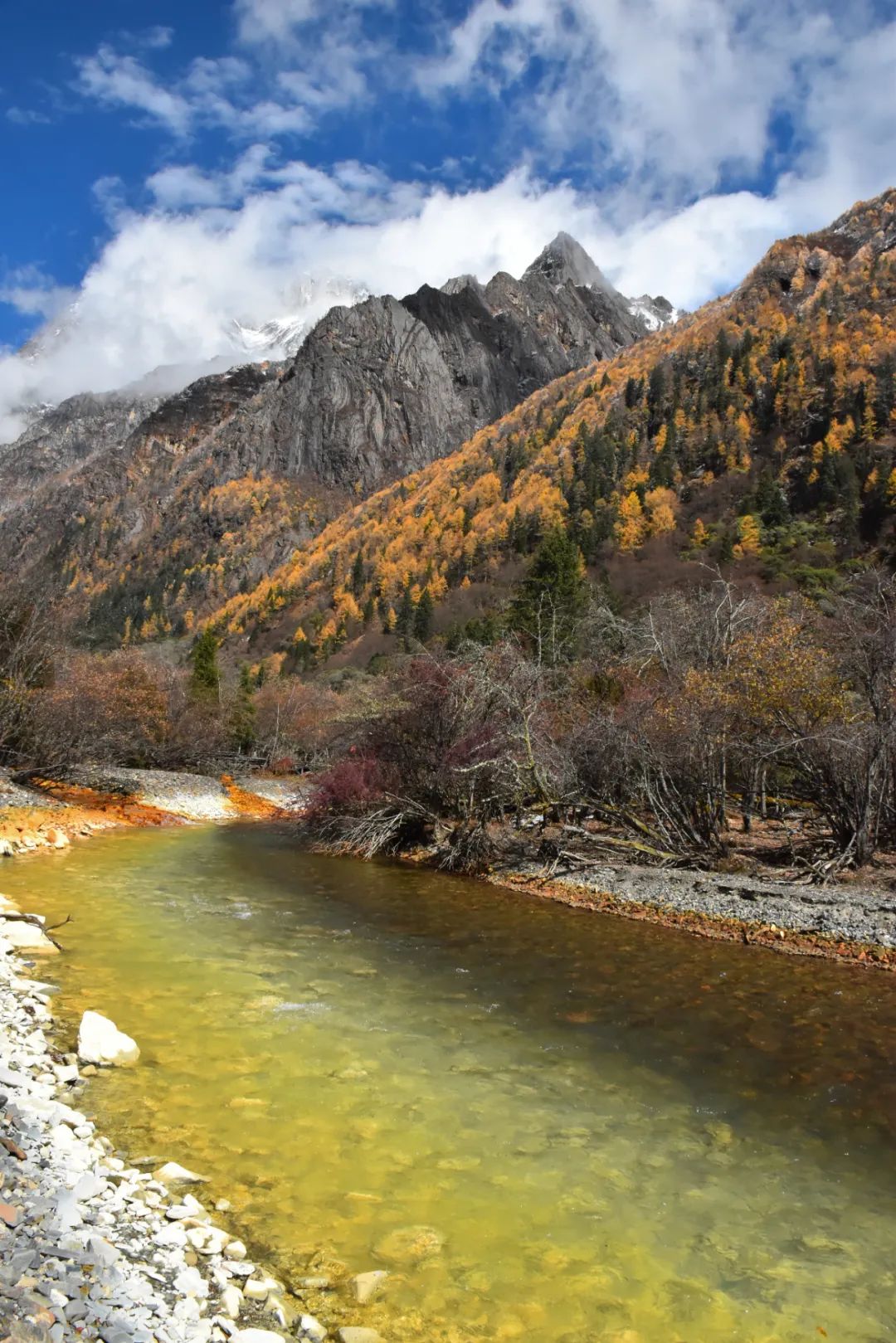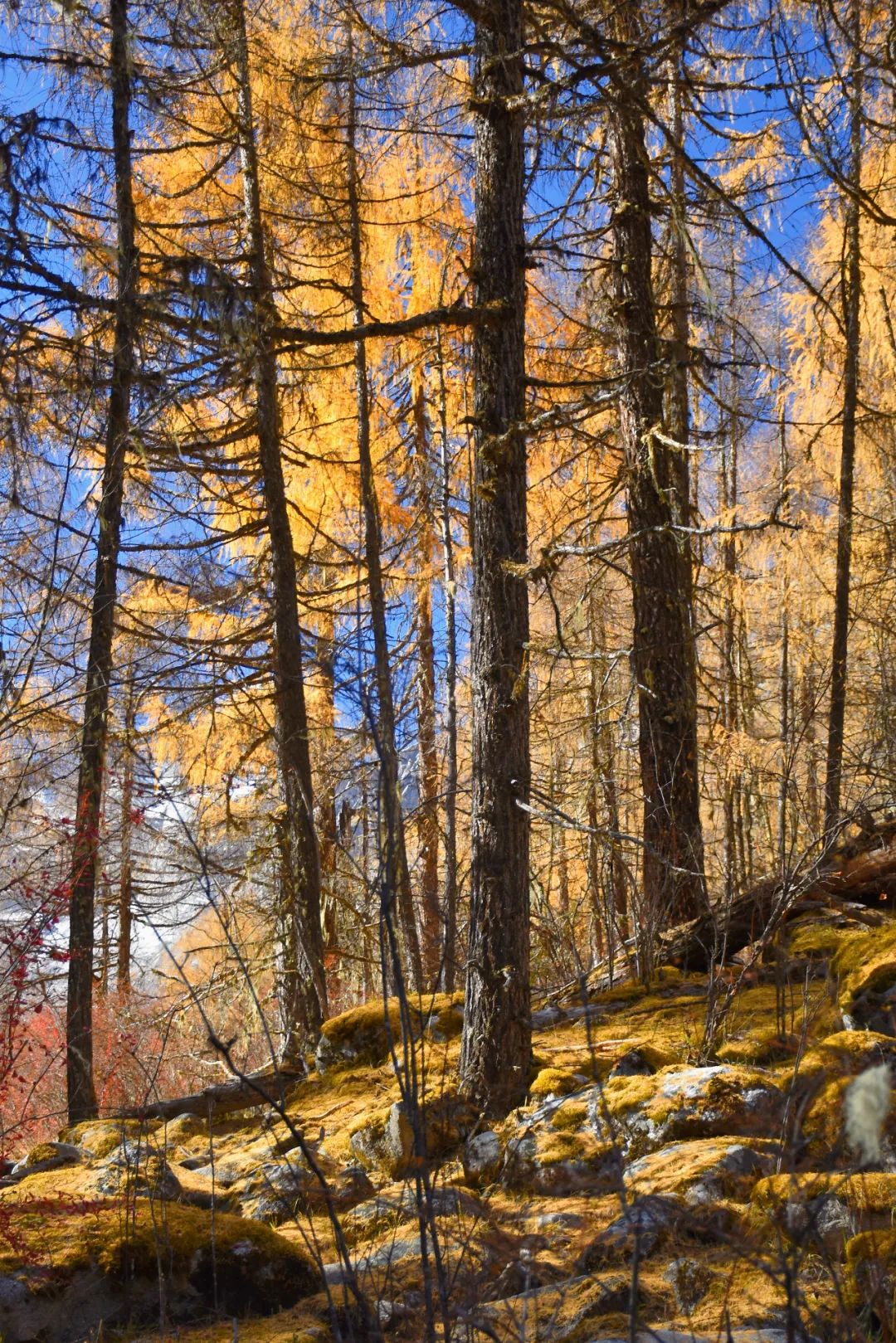 随着我们向沟里越走越深,海拔也在逐渐爬高,彩林先由青里泛黄,再到黄里有青,颜色越来越绚丽夺目,最终整个山谷都变得明亮灿烂。碧玉般的溪流在河谷里静静流淌,阳光从树缝中漏下来,像是撒了一地的金子,我想人在画中游也莫过于此了。