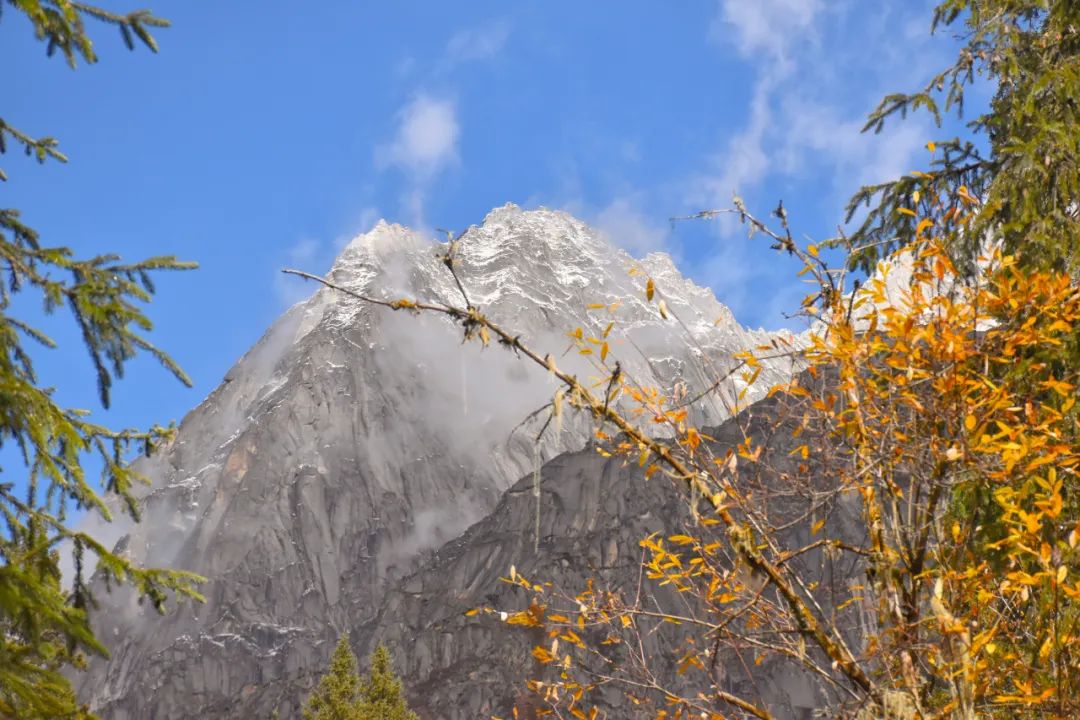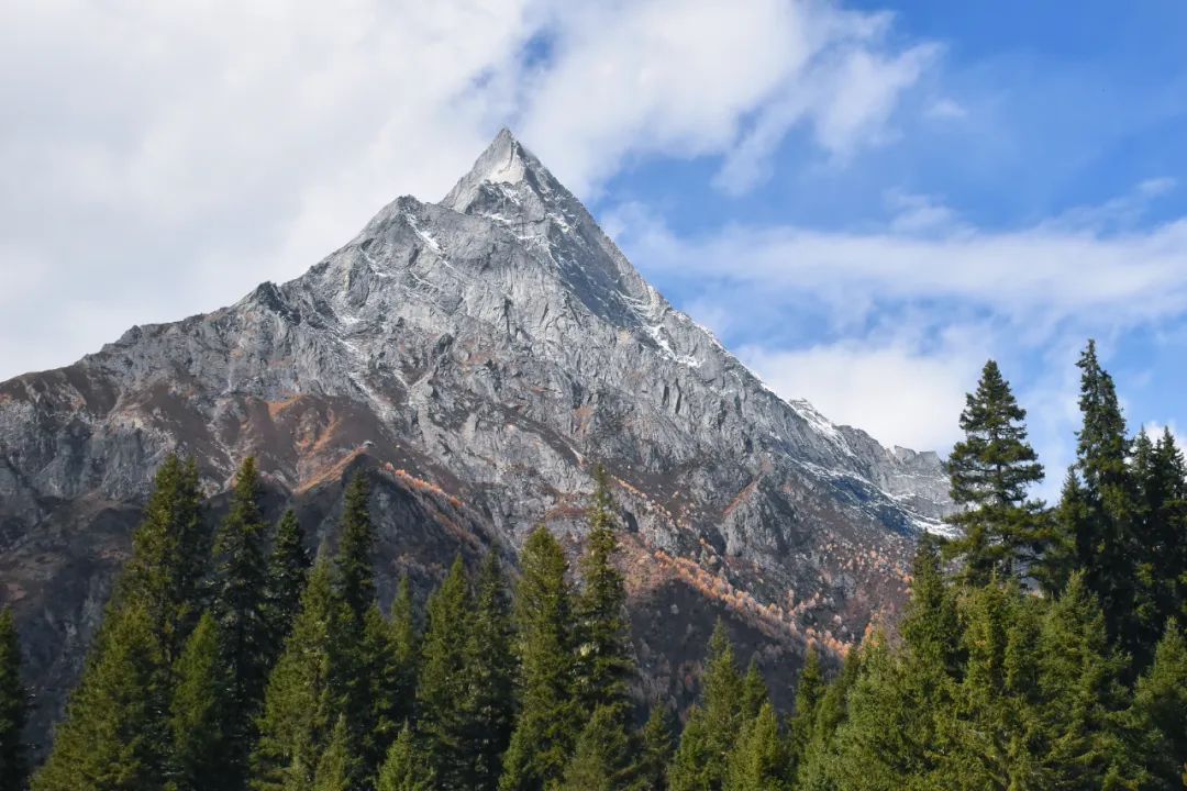 幺妹峰、骆驼峰、羊满台、婆缪峰、羊岗子峰等金字塔雪山一齐拥聚此处,其中外形最独特的当属婆缪峰——如同一把锋利的锥形利剑,海拔 5413 米,被当地百姓亲切称为“ 四姑娘山 的外婆”。