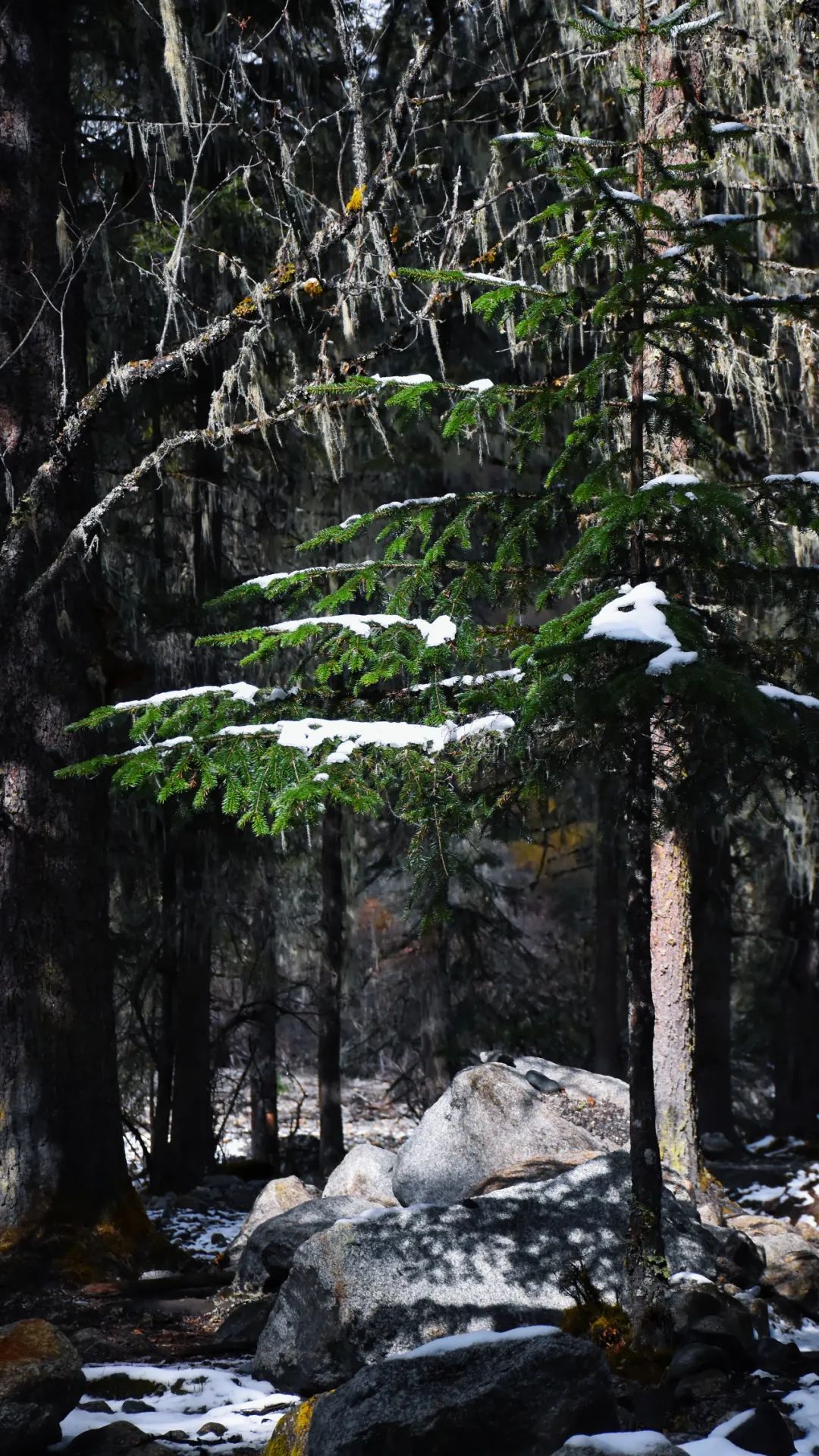 10 月底已经是深秋,有些树木早早就告别秋天,脱下金灿灿的外皮后只剩下枯黄的败叶或深灰色的树干,但正因为颜色层次不一,反倒让整体的画面更加丰富。路上偶尔看到部分松树枝上还挂着没有消融的洁白雪团,远远看去像是种了一大片圣诞树。