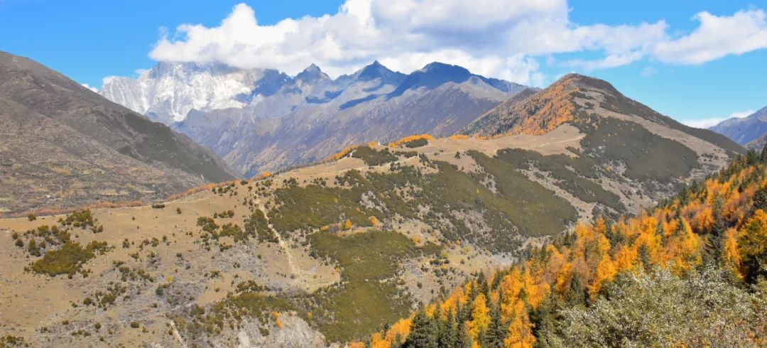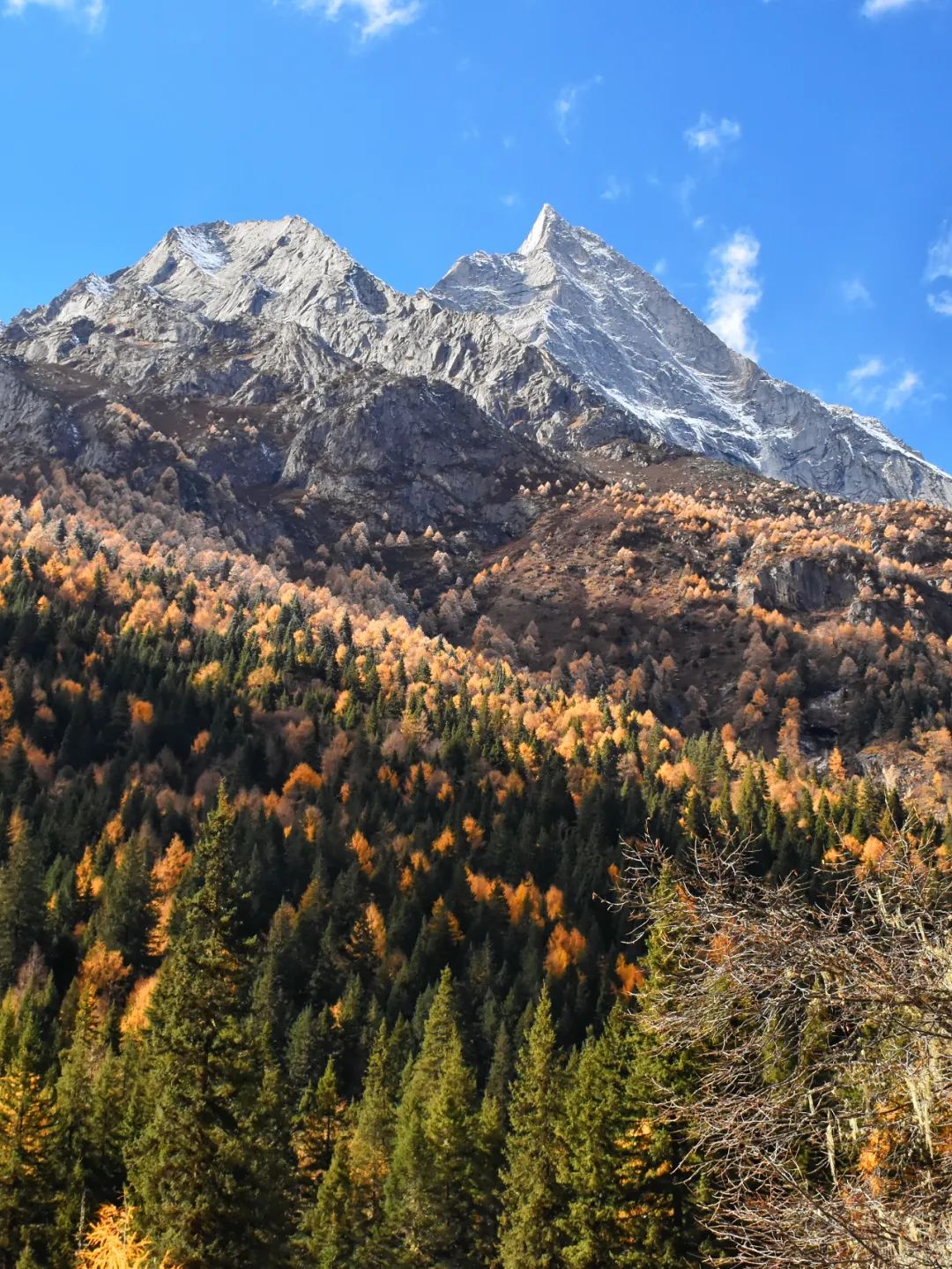 途中经过一个叫“猫鼻梁”的观景点,可以远眺四姑娘山全景,深秋之时,即使是在林木稀疏的山坡上也能见到金色阔叶林,只是覆盖程度略显凄凉。