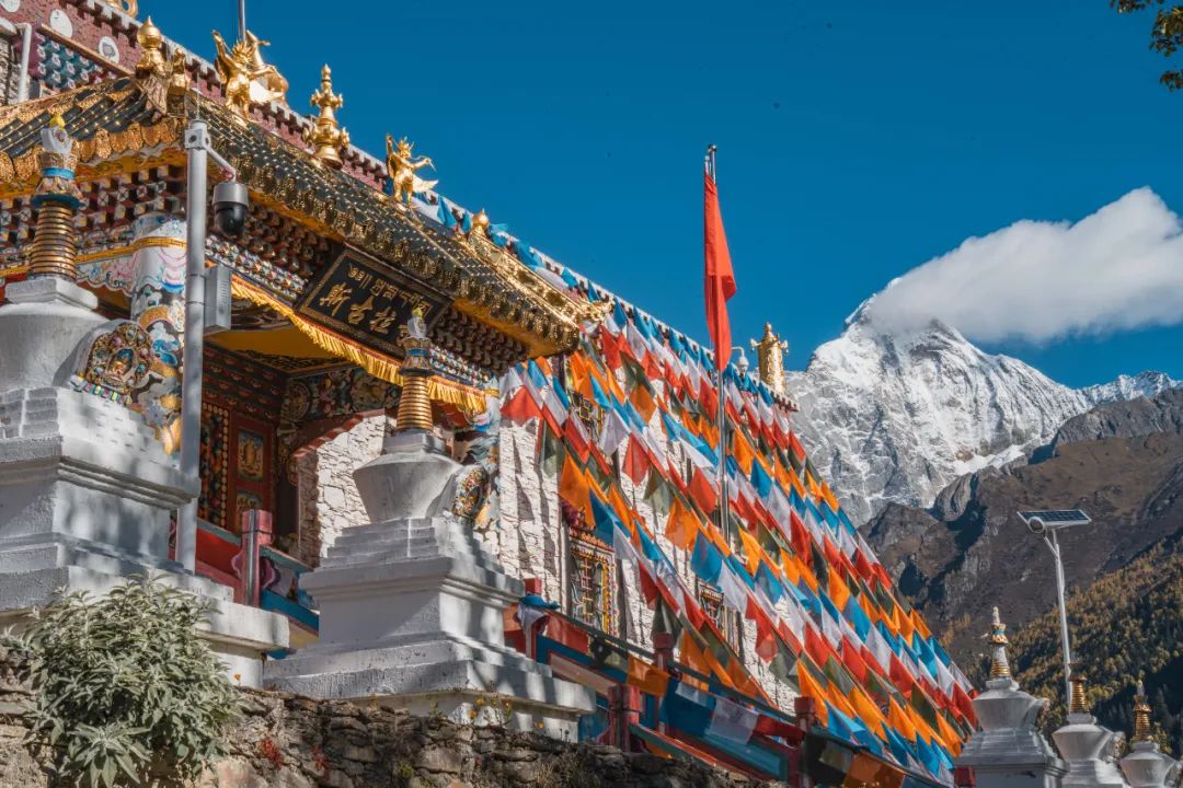 继续往前,很快就能看到一排排整齐有序的现代藏寨,房屋依山而建,以红黄为底色的人类建筑跟自然的色彩完美融合,这里就快到四姑娘山镇了。