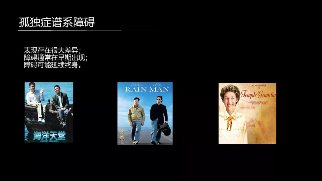 我讲了这么多的特征,我想大家如果没有接触过患者,还是很难想象孤独症患者到底是什么样的。有一些优秀的电影作品可以帮助我们了解孤独症患者的实际生存、生活状况。