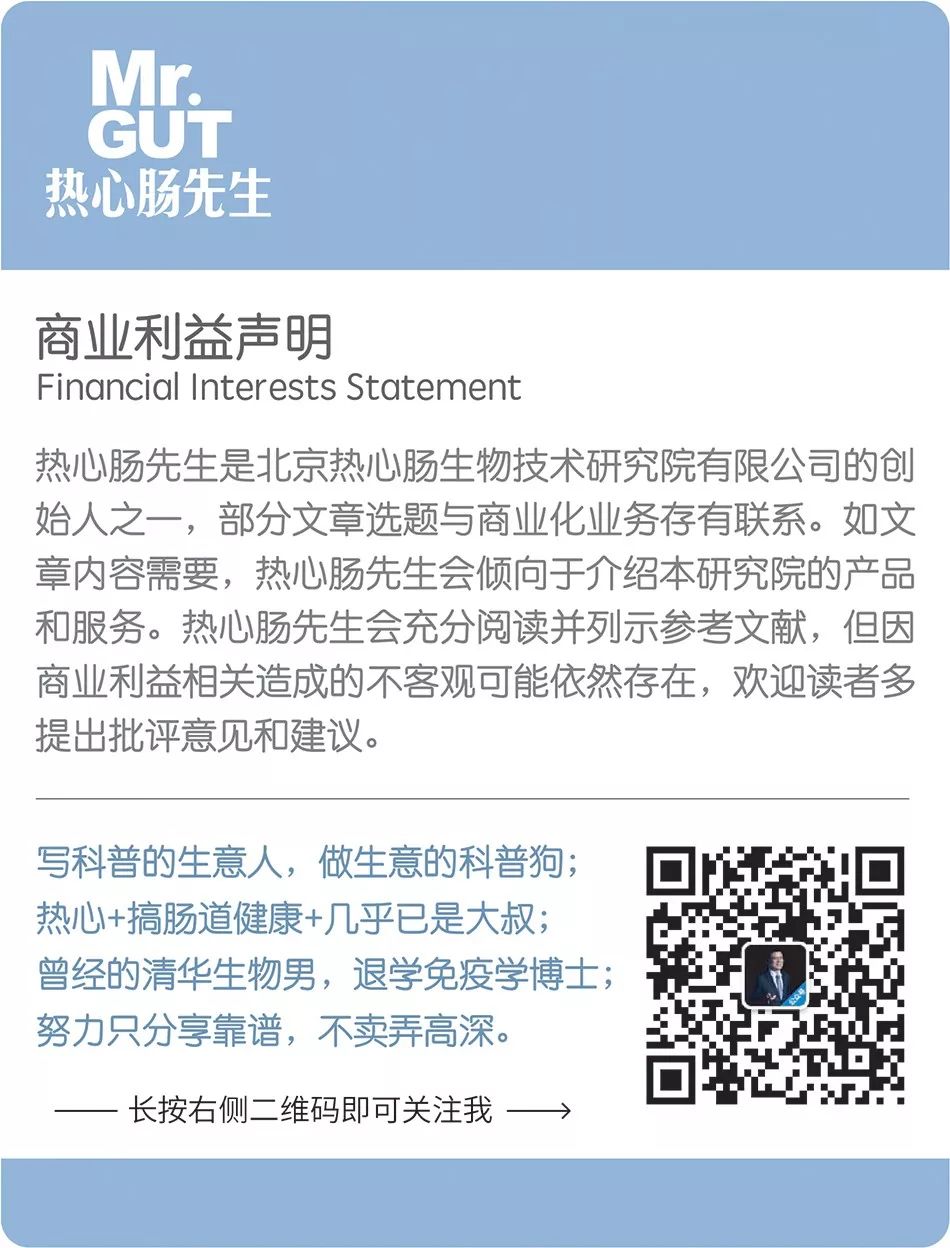 近期必读:25个里程碑 | 现象级中国肠道大会 | 菌群、药物和疗法2019 | 菌群、药物和疗法2018(视频版) | 一论益生菌 | 二论益生菌 | 益生元立场声明 | 学术营销 | 营养领域的肠道菌群机遇 | 2018榜单:国内十大成果 | 全球十大人物 | 最受关注100篇文章 | 最受关注50篇综述 | 月度精华:每月最值得看的30篇文献 | 原创热文:79个超强微生物知识 | 肠道健康第一杀手 | 菌群、药物和疗法2018 | 肠脑魔性关系 | 赵立平《科学》亮剑 | 张发明发明的发明 | 掘金肠道的七大历史机遇 | 宝宝的五个“第一次” | 益生菌产业化的风险 | 利用细菌抗癌 | Protein & Cell专刊:王军 | 陈峰 | 张发明 | 赵方庆 | 傅静远 | 聂勇战 | 于君 | 王则能 | 马永慧 | 肠·道 | 第七期:邱琇 | 朱元方 | 马雄 | 尹佳 | 李华军 | 第六期:程功 | 段丽萍 | 傅静远 | 贾伟 | 姜长涛 | 孔栋 | 赖信志 | 王炜 | 周宏伟 | 第五期:张晨虹 | 吴开春 | 曹清 | 曾建国 | 孙嘉 | 张和平 | 陈峰 | 第四期:赵立平 | 魏泓 | 蔡军 | 辛凤娇 | 刘洋彧 | 杨瑞馥 | 第三期:于君 | 石汉平 | 赵方庆 | 李宁 | 戴小枫 | 曾强 | 郝小明 | 蓝灿辉 | 第二期:Martin J. Blaser | 陈烨 | 章蓉娅 | 王军 | 肖洒 | 武玉钦 | 蓝灿辉 | 第一期:杨云生 | 姜泊 | 钱晓国 | 张发明 | 马永慧 | 陈历俊 | 覃俊杰 | 蓝灿辉 | 热心肠先生年度大课:2019 | 2018 | 2018视频版 | 深度专访:钟胜利 | 刘星吟 | 王炜 | 刘洋彧 | 李铎 |