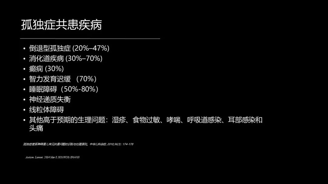 比如说,孤独症儿童的消化道疾病占到30%-70%,是共患率最高的共患病,癫痫占到30%,还有智力发育的迟缓、睡眠障碍、神经递质的失衡、线粒体功能的障碍等等。