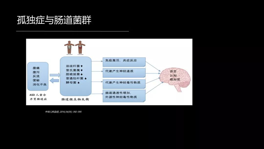 孤独症儿童的消化道疾病以及肠道微生物的失调,比如说双歧杆菌的降低,酵母菌的升高等等,可能会导致免疫的激活,可能会代谢产生一些毒素还有神经递质,进而都会去影响大脑的语言认知和感知觉,造成这些功能的异常。