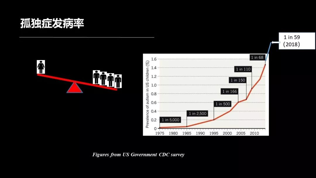 在2005年左右的时候,孤独症发病率是1 : 166,那这个已经远远高于之前的一些报道了;到了去年,2018年的时候,这个数字竟然变成了1 : 59。
