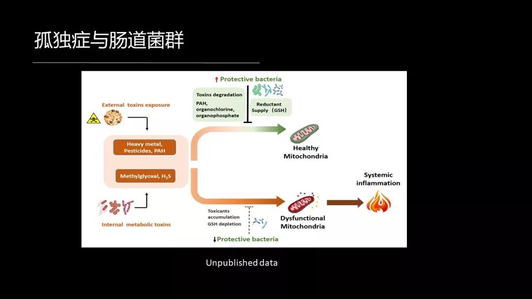由于保护性菌群的降低,就会导致外源性毒素还有内源性毒素的降解发生障碍;这些毒素会进一步的积累,造成谷胱甘肽的耗竭;而谷胱甘肽的耗竭会导致线粒体功能的障碍,进而导致系统性炎症的发生。