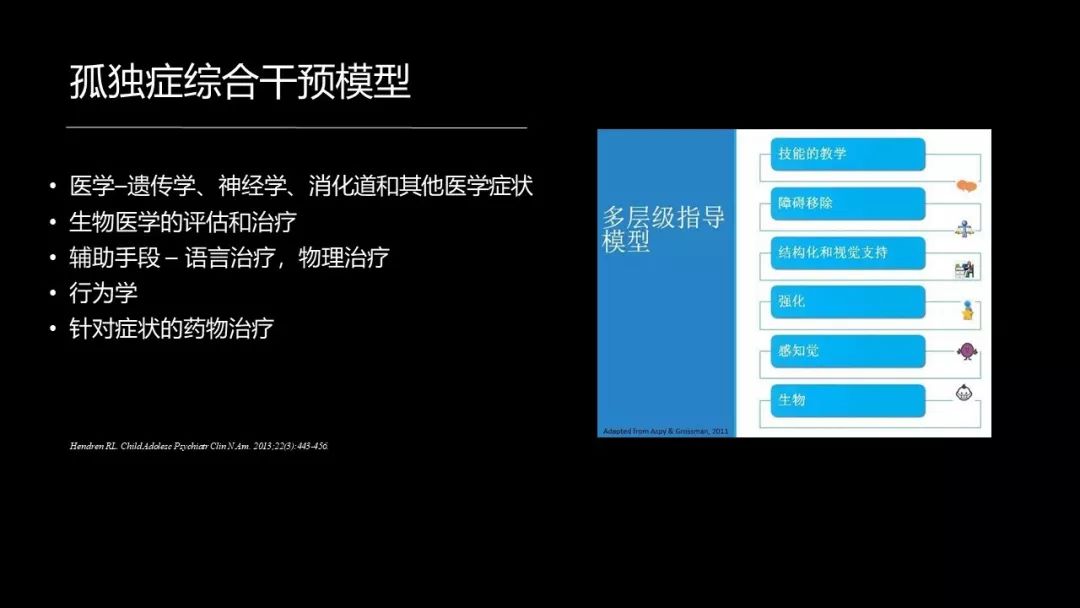 同时,在多学科的基础下,我们需要进行一个综合干预,综合干预的层级包括生物医学的问题,包括感知觉的问题,包括行为学的强化还有视觉的支持等等。