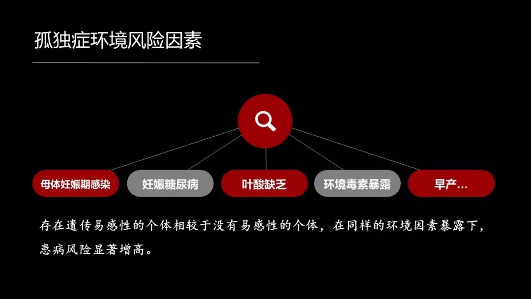 我们已经知道的环境风险因素,包括母体的妊娠期感染、妊娠糖尿病、叶酸的缺乏、环境毒素的暴露以及早产等等,都与孤独症的发生有关。