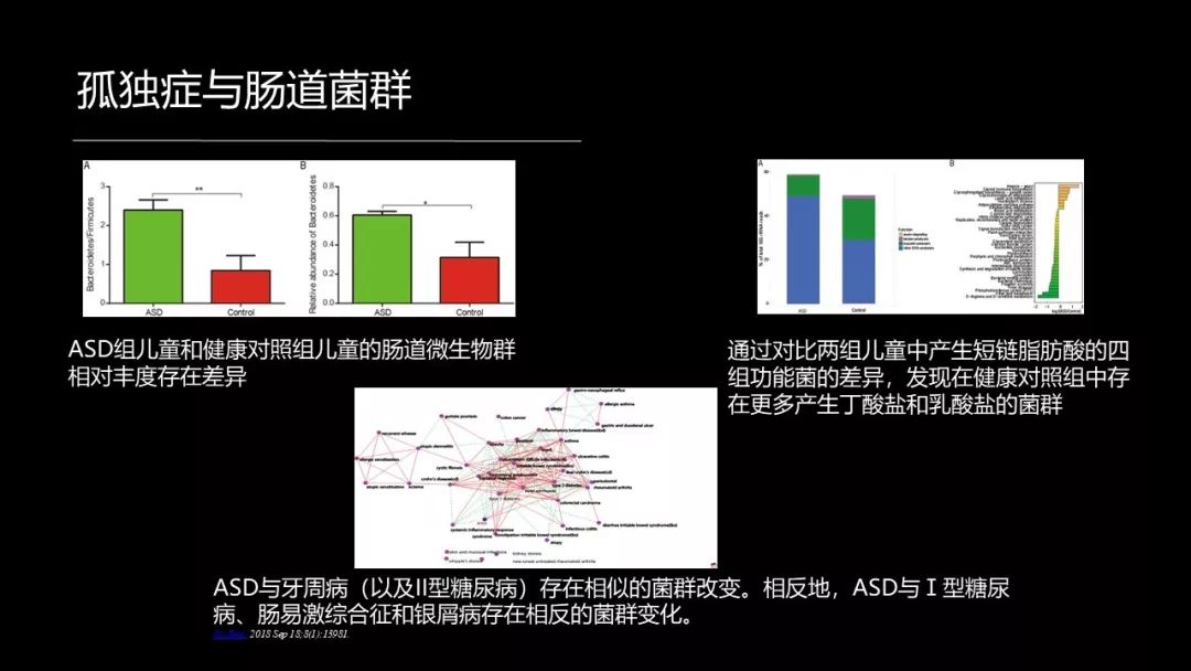 通过对比疾病的微生物改变的数据库,我们可以看到孤独症儿童的肠道菌群的改变与牙周病存在一个相似的菌群改变,与Ⅰ型糖尿病、肠易激综合症等等则存在一个相反的菌群改变。