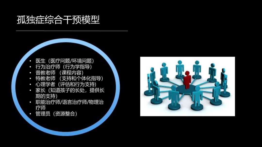 我们来看一下,孤独症需要一个综合干预模型,需要多学科通力合作这样的一个团体作业。