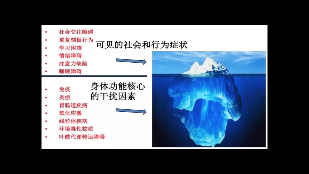 但是,我们看不见的是他身体功能的核心干扰因素,这个里面包括免疫和炎症,包括胃肠道疾病,包括氧化应激、线粒体疾病、环境毒素等等。