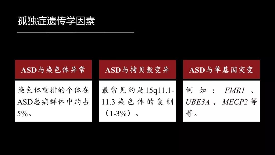 我们来看孤独症的遗传学因素,孤独症的遗传学因素,包括染色体的异常,包括拷贝数变异,包括与单基因突变的关系。