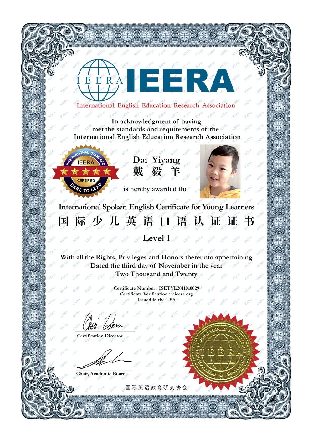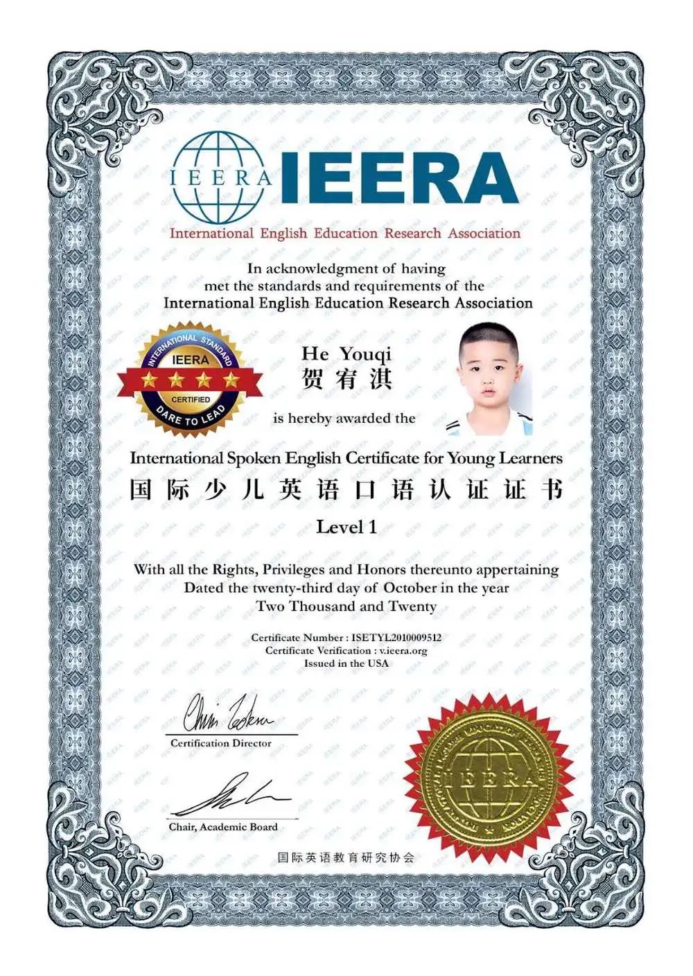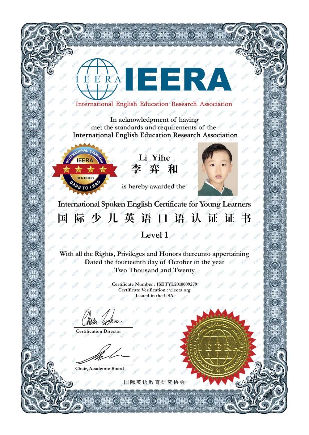 此外,昫昫还高分通过了IEERA的国际少儿英语口语认证考试(ISET—YL)全部五个级别的考试!真是妥妥的学霸哇!