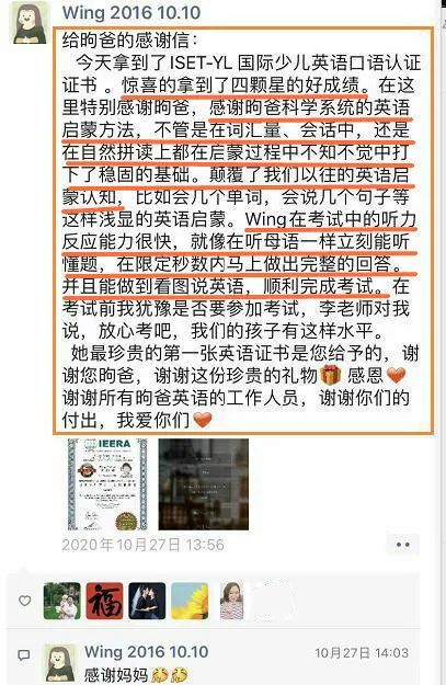 别着急,下面这两位宝妈和大多数家长一样,英语水平一般,她们起初也不知道如何给孩子做英语启蒙,更没办法自己直接教。但她们的宝贝和昫昫一样,现在也高分通过了IEERA的ISET—YL口语考试。