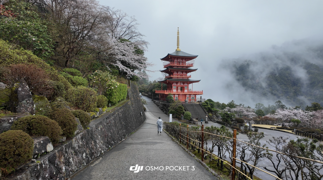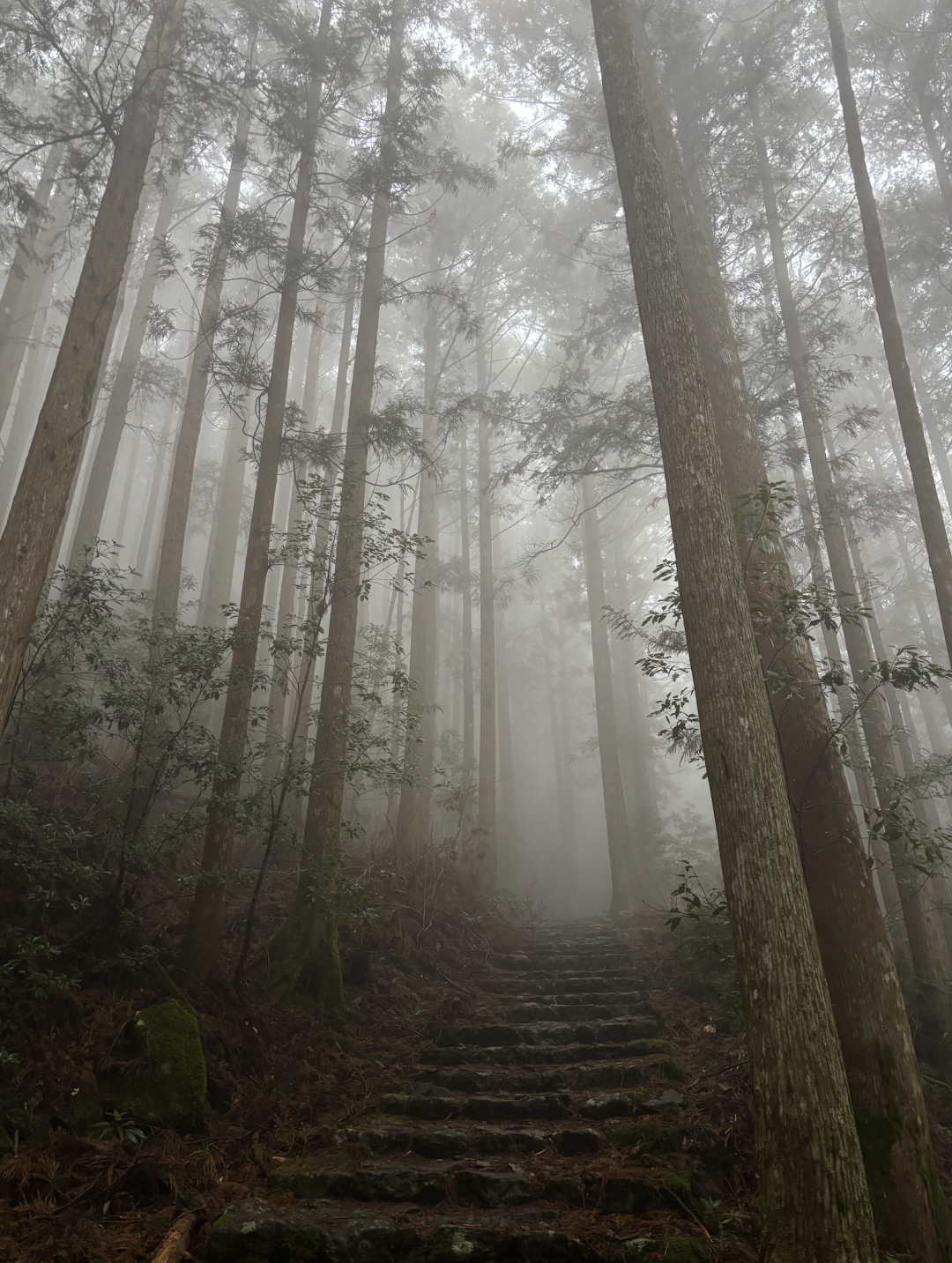 到达茶屋稍作调整,继续朝着那智瀑布前进。出发时,天空落下细雨,为行程增添了几分诗意。随着脚步的迈进,细雨逐渐变成淅淅沥沥的小雨,山林间弥漫起薄薄的雾气,人在此间仿佛置身仙境。然而,湿滑的路面也给徒步增添了不少挑战,也让我更加小心谨慎的对待迈出的每一步。身处天然的白噪音之中,风声、雨声、鸟鸣声,每走一步我的心都更能沉下一分,静静欣赏大自然在此时此刻对我的馈赠。