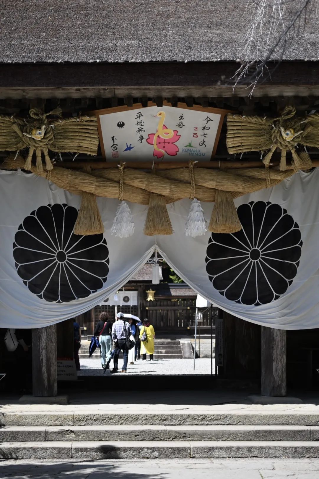 到达本宫大社,作为正门的神门、参拜殿等在古色苍茫中让人感到沉着安详。神殿的入口处系有粗大的注连绳,可见这里地位崇高。熊野信仰与自然息息相关,同时也被视为日本精神与灵魂的原点。