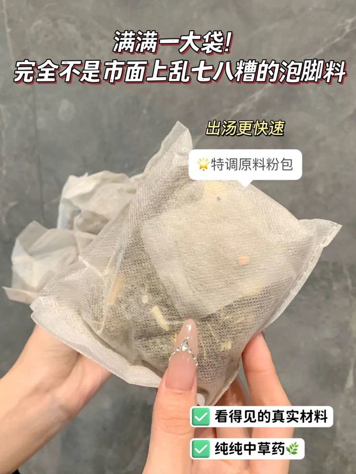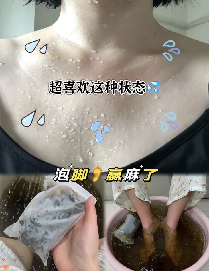 里面的草本植物,泡它时能感到腿和脚的末梢血管扩张加速下半身的血液循环,出的汗更多是多余水分跟湿气。
