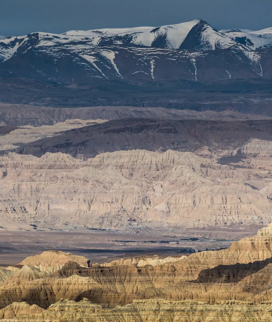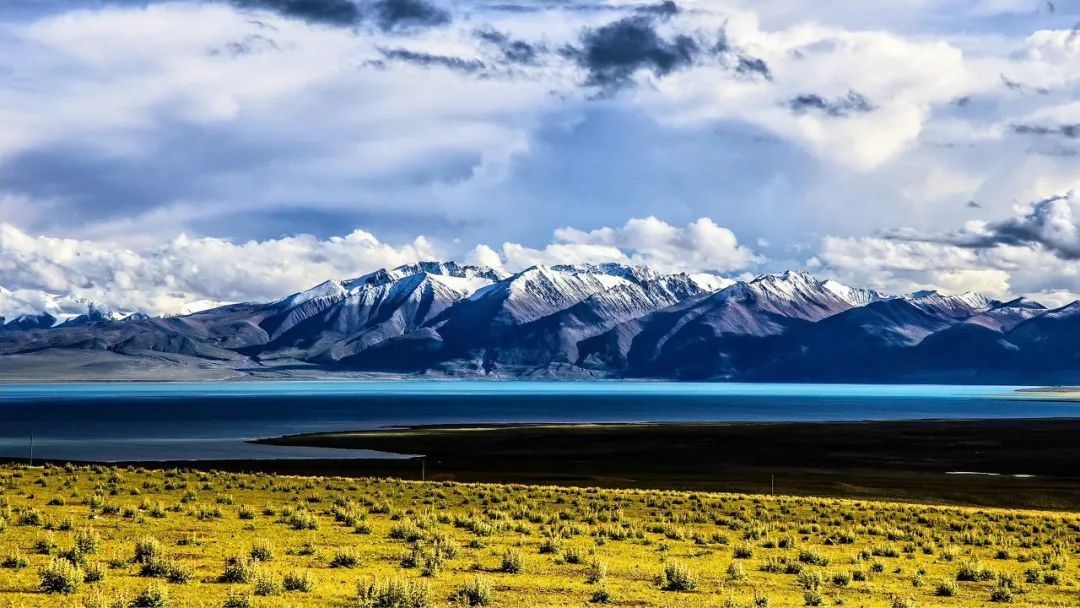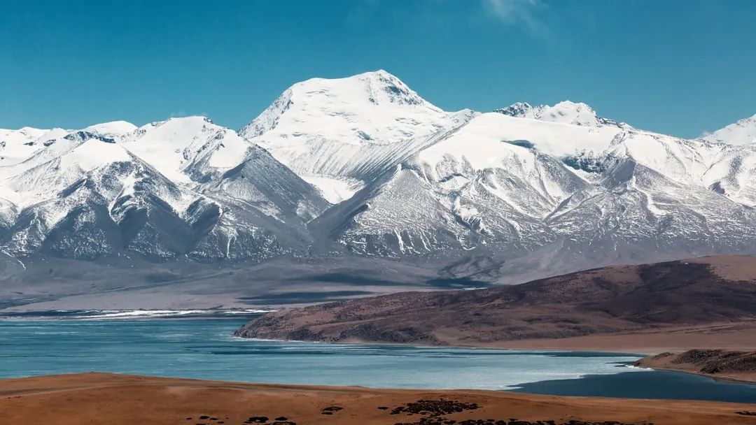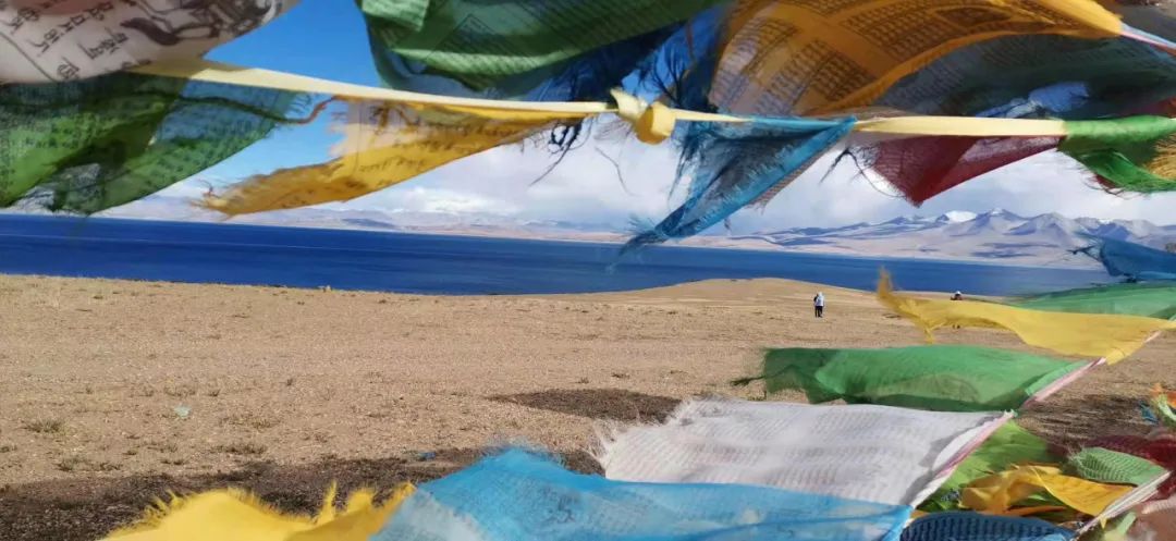 玛旁雍措衬着经幡雪山可太美了