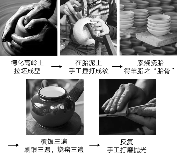 每只茶器用800 度素烧成陶,赋予其筋骨;800 度素烧去蜡,固定梅子青釉的幽幽色泽;