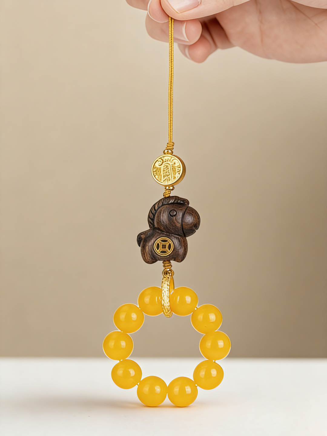 檀木雕的小马线条流畅温柔,小马造型呼应“马跃财门”,象征奔腾向前的活力。