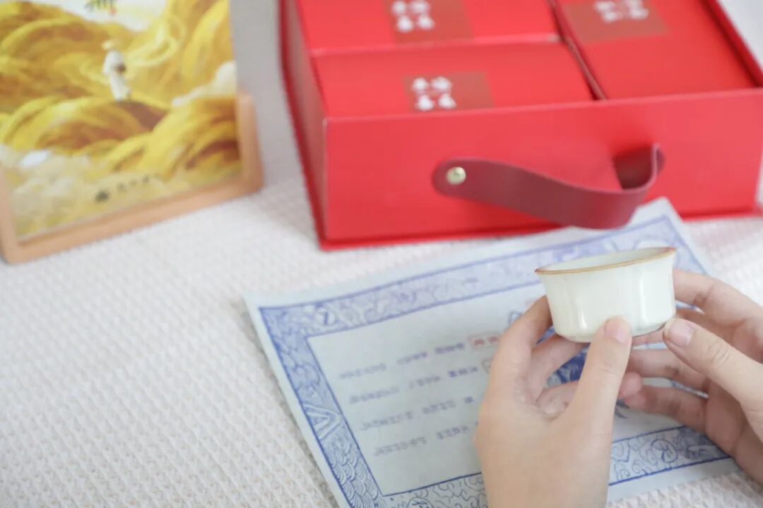 非遗汝窑六方杯出自非遗谢双贵大师鉴制而成,并且礼盒中带有大师亲签收藏证书;