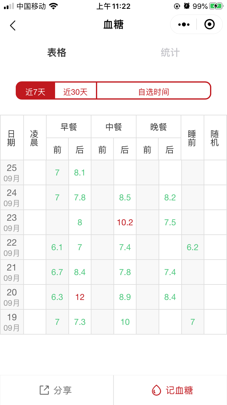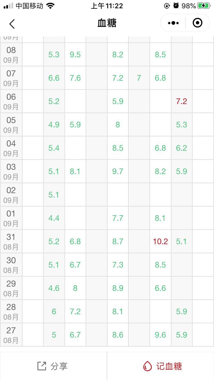 我感觉又回到了我加入特训营之前的时候,每天筋疲力尽还是控不住血糖。在咨询老师之后,老师很耐心地安抚我,告诉我这个是糖友的应激反应,不用担心。之前我也有过这种烦躁疲惫的时候,心中一直百思不得其解,听了老师的话我才恍然大悟,心情也平静下来了。