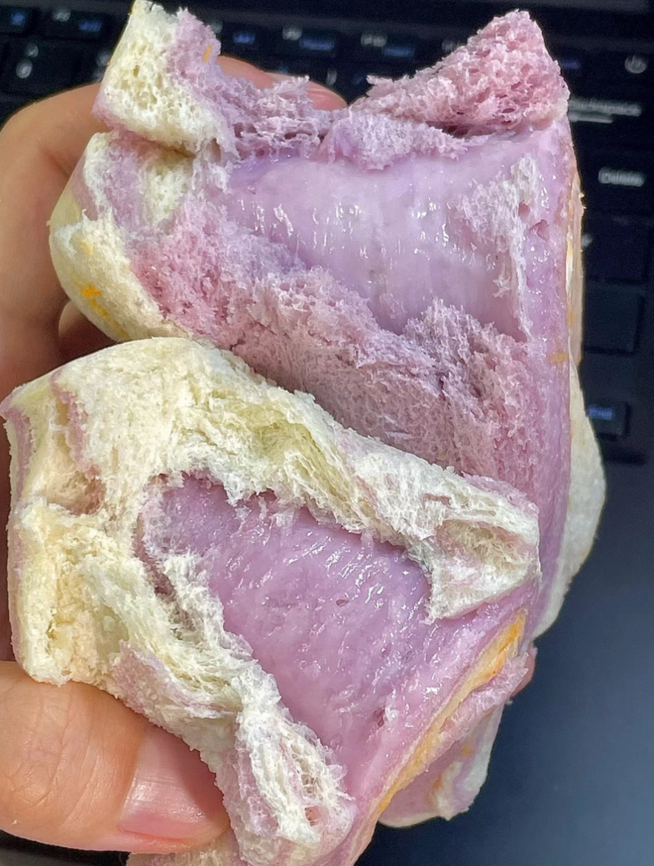 面包夹着芋泥肉松以及牛油果肉松两种口味区别.