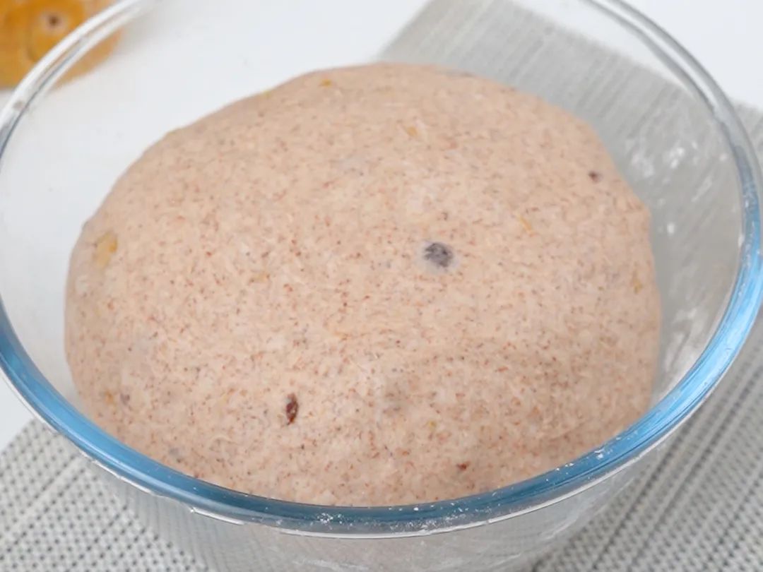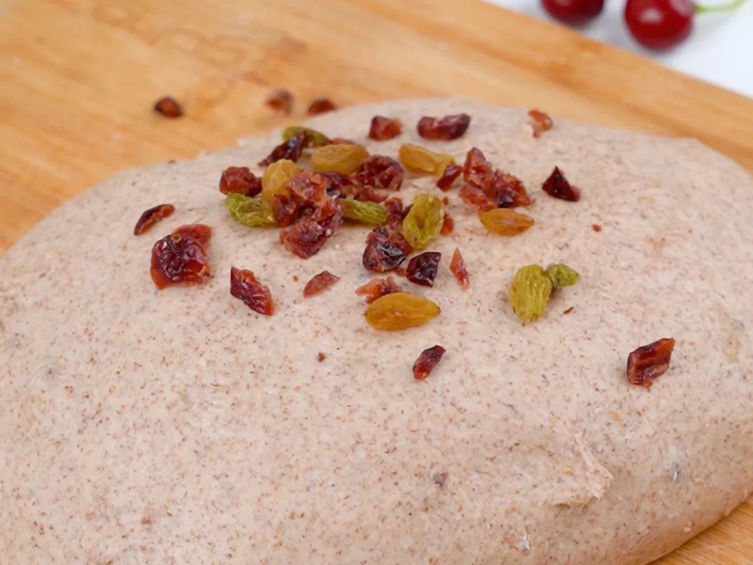 4.加入果干,揉匀即可,盖保鲜膜发酵至原体积的2倍大