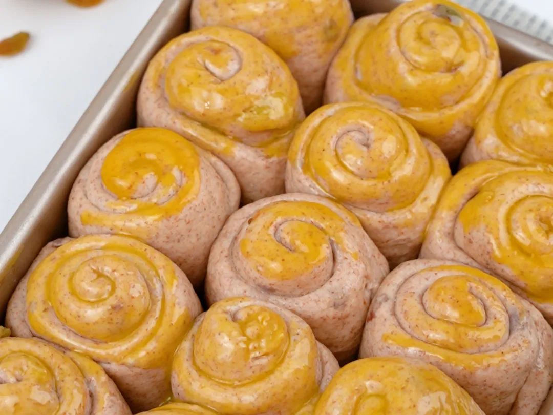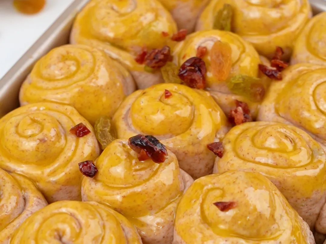 8.发酵至原体积的1-1.5倍大左右,表面刷上一层蛋黄液,撒上果干