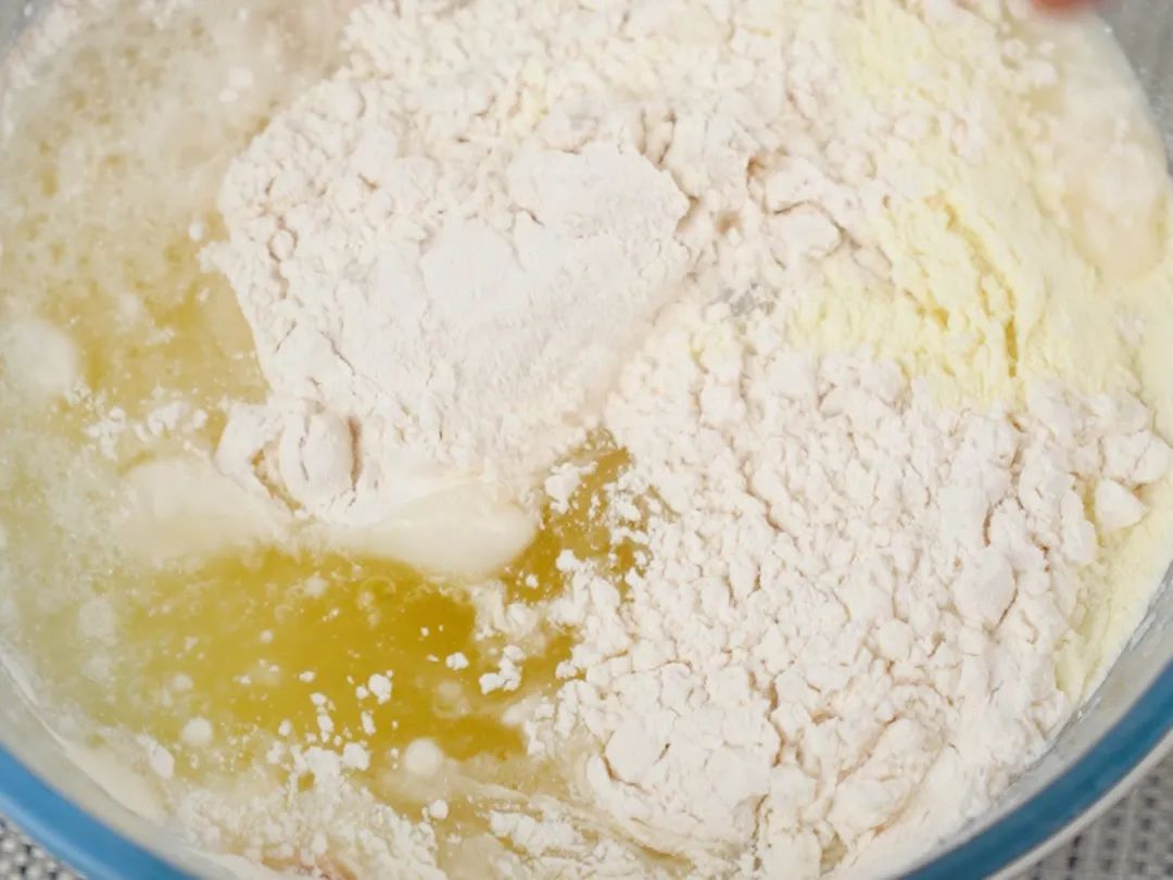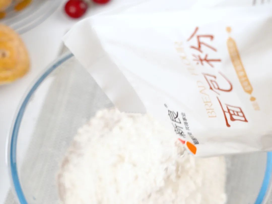 1.容器内倒入面粉,加入糖、盐、酵母、奶粉,倒入水