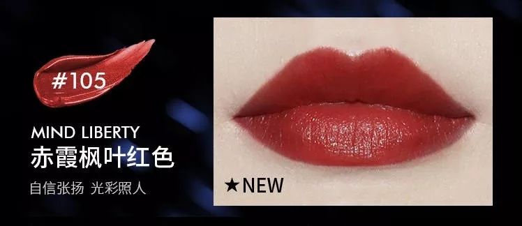第二支推荐,105号,官方颜色为:赤霞枫叶红色,似乎是一抹枫叶红染在了嘴唇上,显得性感而诱惑。