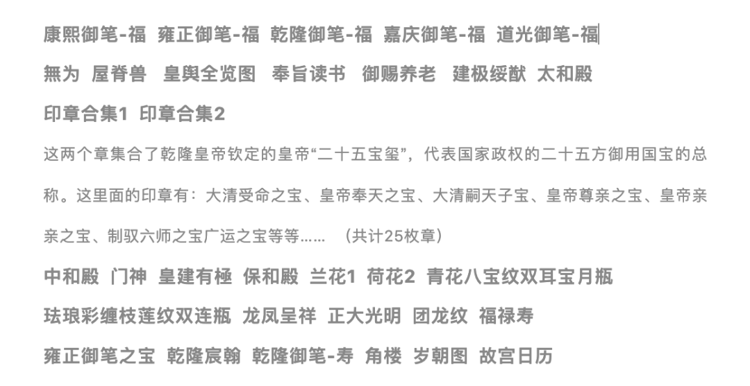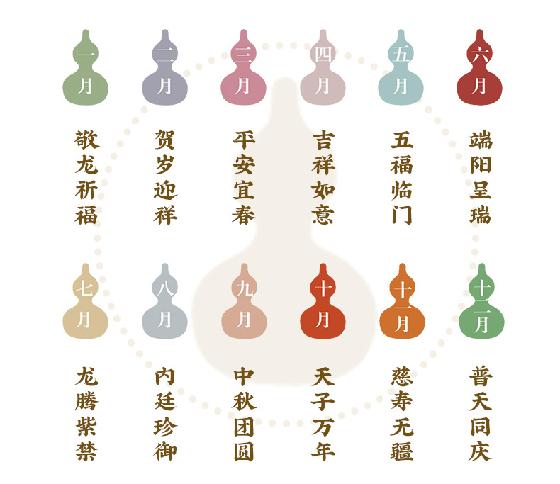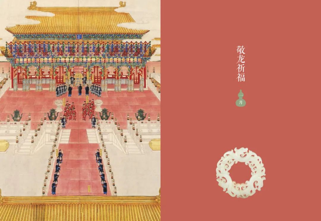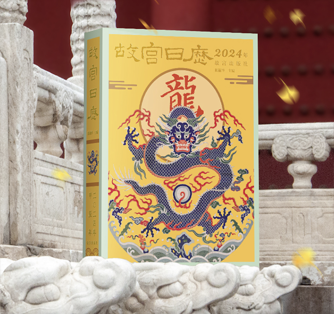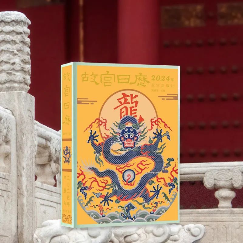 这版故宫日历,堪称全面介绍生肖龙文物故事及其关联知识的读本。封面图案选用清代黄地九龙牡丹纹漳绒毯局部,腾飞于海水江崖之上的祥龙,充满活力。以生肖为主题的《故宫日历·2024年》一共收有93件龙文物图片,充分展现了紫禁城中的龙元素。不仅是一本日历,更是了解故宫博物院所藏相关龙文物的龙年手册。八月为宫廷所用家具、文房和服饰等上的龙元素,如柜子、五色墨、龙纹蜡笺、绣着龙纹的朝服等。除龙文物外,还聚焦中国传统节庆,对于古人的节庆和祝寿活动作了生动而具体的呈现。二月至五月围绕“宫中过年”主题,涵盖元旦至元宵节期间宫中的风俗介绍和相关文物展示;六月为“端午节”宫中的风俗介绍和相关文物展示。九月为“中秋节”宫中风俗的相关文物;十月至十二月围绕“帝王贺寿”主题,分皇帝生日、太后生日和举国同庆三个方面。新月开启页,从文物中选取12种相关色彩呈现,在细节处感知中国古色之美。敬龙祈福、 贺岁迎祥、神州生春、吉祥如意、五福临门、端阳呈瑞、龙腾紫禁、内廷珍御、中秋团圆、天子万年、慈寿无疆、普天同庆。