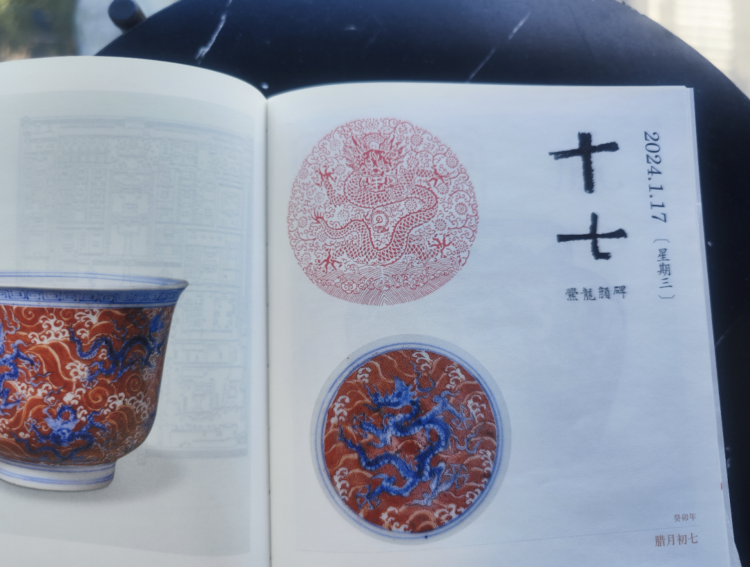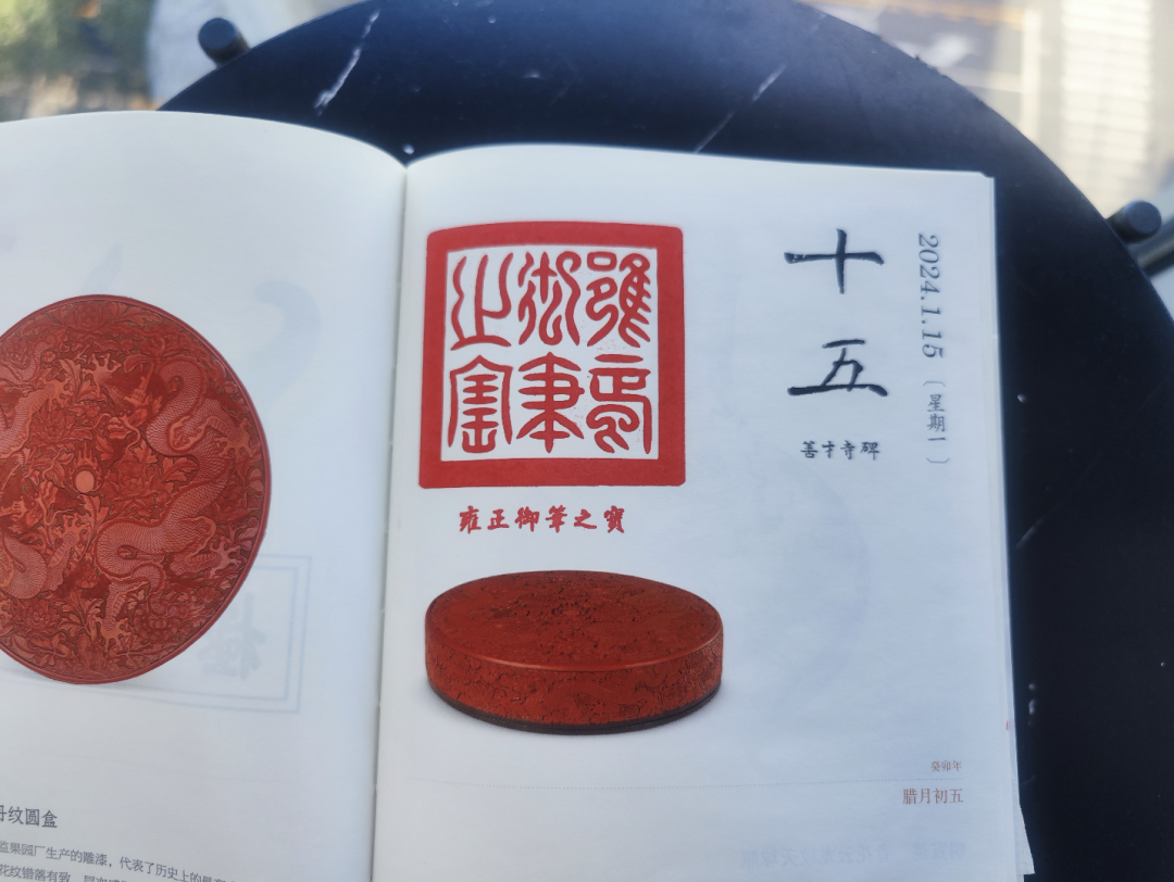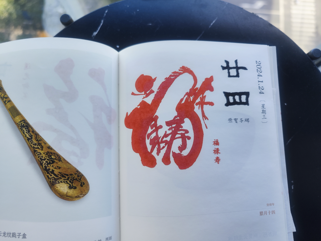 一则刊登在《益世报》上的广告,几乎引发了全民性的抢购热潮。令人惊讶的是,报纸上售卖的不是外贸洋货,也并非每家必备的日常用品,而是一本经由故宫博物院发起并制作的日历。“顷接故宫日历一册,既有阴阳日历可察,复逐日有古物照片欣赏 (二月二十与五月廿四重复),实日历中最佳之作,拜领谢谢矣。”但后因战争突起,《故宫日历》只出版了五年,便戛然而止。2009年,故宫出版社以1937年版为蓝本恢复出版《故宫日历》,标志着遗忘经年的它又重新回来了!重版之后,《故宫日历》迅速成为了故宫家庭的头部“网红”,每年发售都会引发讨论、抢购。的确,在家里收集齐这么一套故宫日历,似乎是将看不见摸不着的岁月,具化成了一张张可以翻阅、可以摩挲的日历。珍重而有意义。这一次,2024年的《故宫日历》,我们也是如约提前抢到了发授权。每天一个故宫博物馆的馆藏文物及其详细介绍,右边为阳历、阴历和节气介绍。今天的心情、发生的新鲜事、想要纪念的事物,都可以写在日历里。