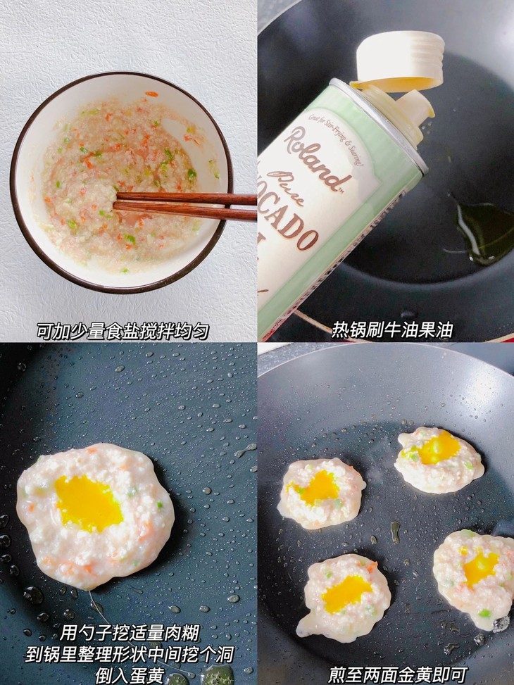 ❸热锅倒入可热炒牛油果油,用勺子取适量肉糊,整理成圆形,中间镂空,倒入蛋黄