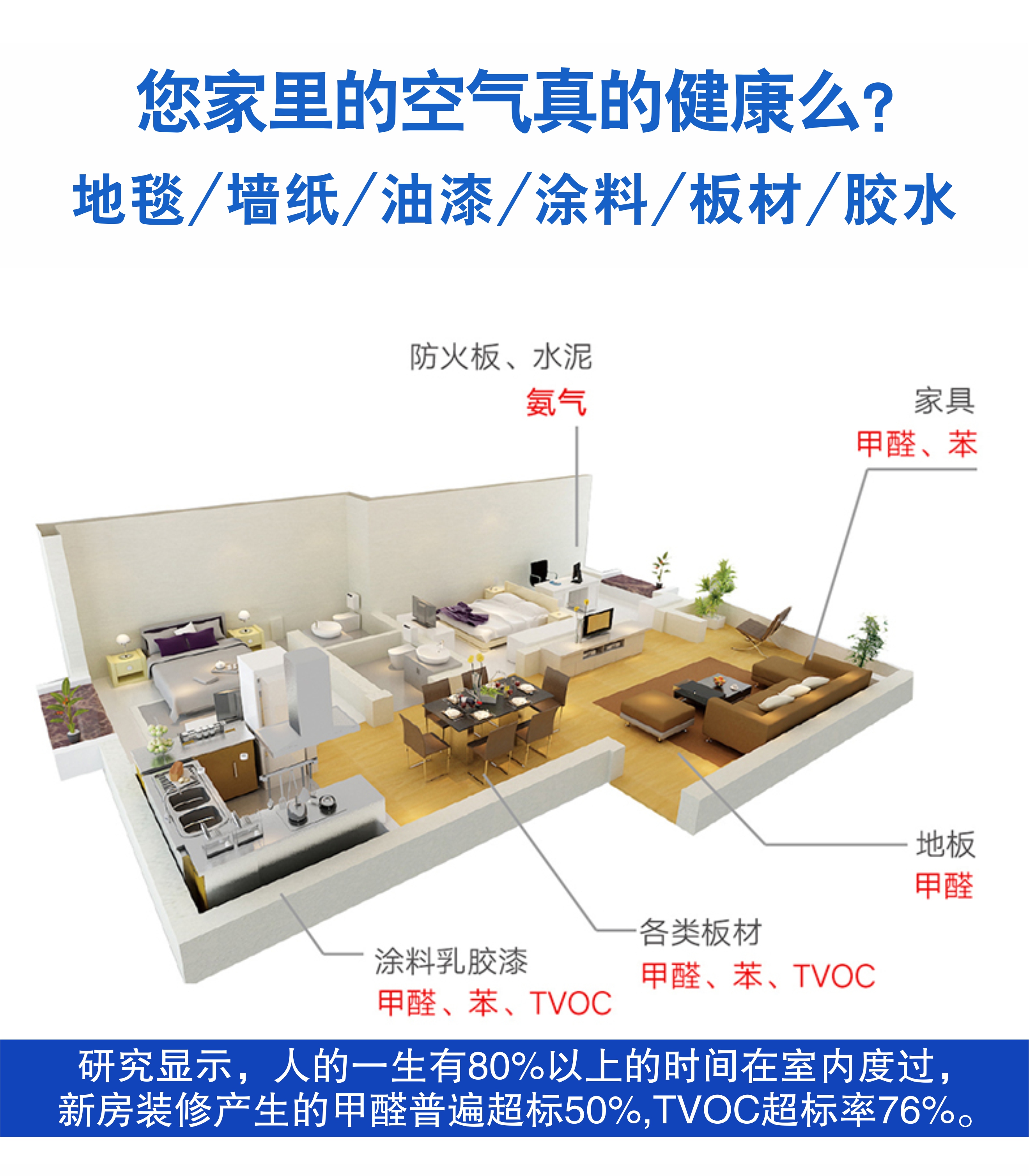 长期释放源包括装修用的各种人造板、人造板家具、复合地板等,其中含有的甲醛挥发期可达到3-15年之久,是必须要通过有效的治理进行解决的。
